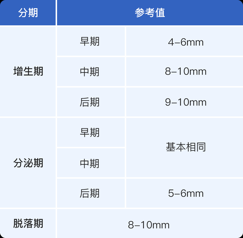 ③、分泌晚期:月经周期的第24-28日,也是月经来潮前期,子宫内膜厚度正常值会达到10mm。