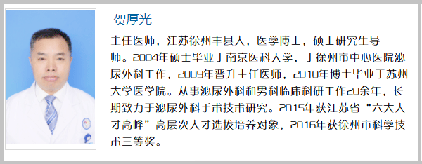 贺厚光,徐州市中心医院泌尿外科、生殖医学中心主任医师,教授,江苏徐州丰县人,医学博士,硕士研究生导师。1991年本科毕业于徐州医学院(现徐州医科大学),于徐州矿务集团第二医院工作,2004年硕士毕业于南京医科大学,于徐州市中心医院泌尿外科工作,2009年晋升主任医师,2010年博士毕业于苏州大学医学院。