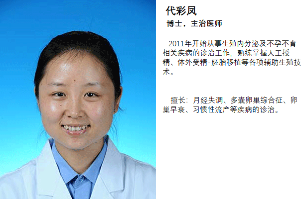 代彩凤,山东大学齐鲁医院不孕不育诊疗中心主治医师,2001年~2006年就读于滨州医学院,获得临床医学学士学位。