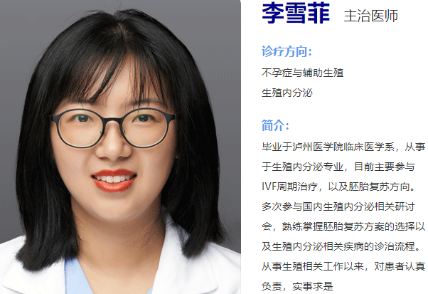 李雪菲,成都西囡妇科医院主治医师,毕业于泸州医学院临床医学系,从事于生殖内分泌专业,目前主要参与IVF周期治疗,以及胚胎复苏方向。多次参与国内生殖内分泌相关研讨会,熟练掌握胚胎复苏方案的选择以及生殖内分泌相关疾病的诊治流程。